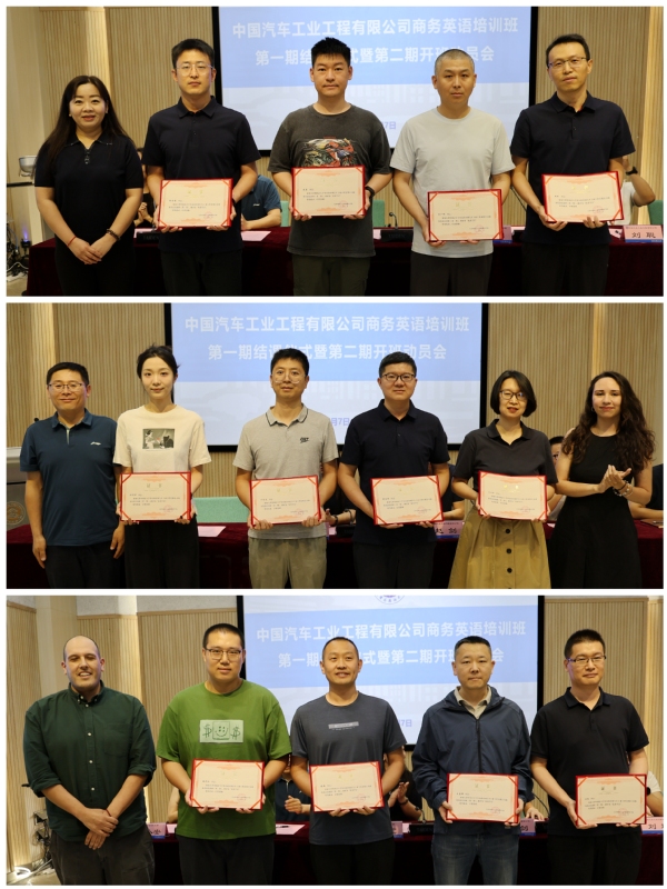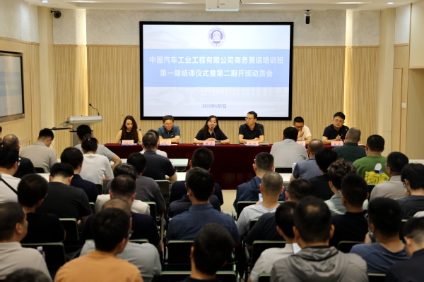上午10时,商务英语培训班第一期结课仪式暨第二期开班动员会在逸夫楼大江厅举行。中国汽车工业工程有限公司涂装工程院副经理赵剑、刘聪,天外公司党总支书记田芃、副经理于忠国、副经理古亮等参加活动。仪式上,全体人员首先观看了天外介绍视频,共同了解公司的办学特色与发展脉络。田芃在致辞中对公司基本情况进行了介绍,同时感谢企业对公司的信任,期待第二期培训取得更加丰硕的成果。教师代表苏小安分享了教学感悟,承诺将持续优化课程设计,提升学员商务英语应用能力。随后,公司领导与教师为第一期优秀学员颁发了表彰证书。赵剑在发言中对公司本次培训给予了高度肯定和感谢,强调校企合作对企业人才培养的重要性,并希望以培训为纽带,推动双方在技术交流、人才共育等领域开展更多务实合作。仪式最后,全体人员合影留念,为第一期培训画上圆满句号,也为第二期合作拉开序幕。