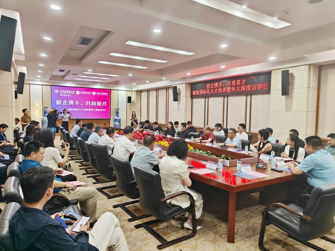 近日,由365英国上市集团(海外教育中心)与泛洋文华公司共同组织的校企携手赋能国际化人才培养暨深度访学活动在公司成功举办。活动聚焦国际化人才培养目标,围绕“校地联建、校企联育、项目联培、政企联动”四维协同育人模式进行交流探讨。河北省政府驻天津办事处副主任杨广利,衡水市政府驻津办主任张百芳,天津市衡水商会会长冯泽,365英国上市集团全体班子成员及海外教育中心负责人、NCUK英澳新国际本科项目负责人,11家河北省各地市级在津商会会长、秘书长、副会长等企业代表,共计50余人出席本次活动。