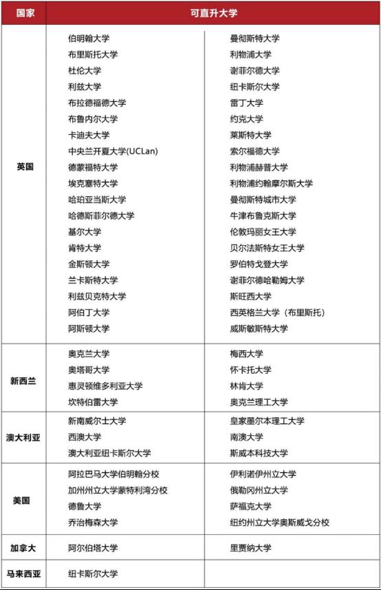 新南威尔士大学(QS 世界排名第 19 位)、曼彻斯特大学(QS 世界排名第 34 位)、布里斯托大学(QS 世界排名第 54 位)、奥克兰大学(QS 世界排名第 65 位)、西澳大学(QS 世界排名第 77 位)、伯明翰大学(QS 世界排名第 80 位)、利兹大学(QS 世界排名第 82 位)、杜伦大学(QS 世界排名第 89 位)、谢菲尔德大学(QS 世界排名第 105 位)