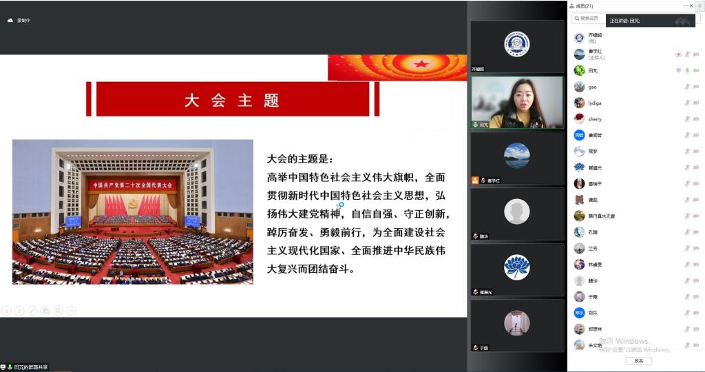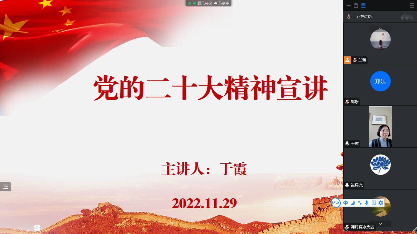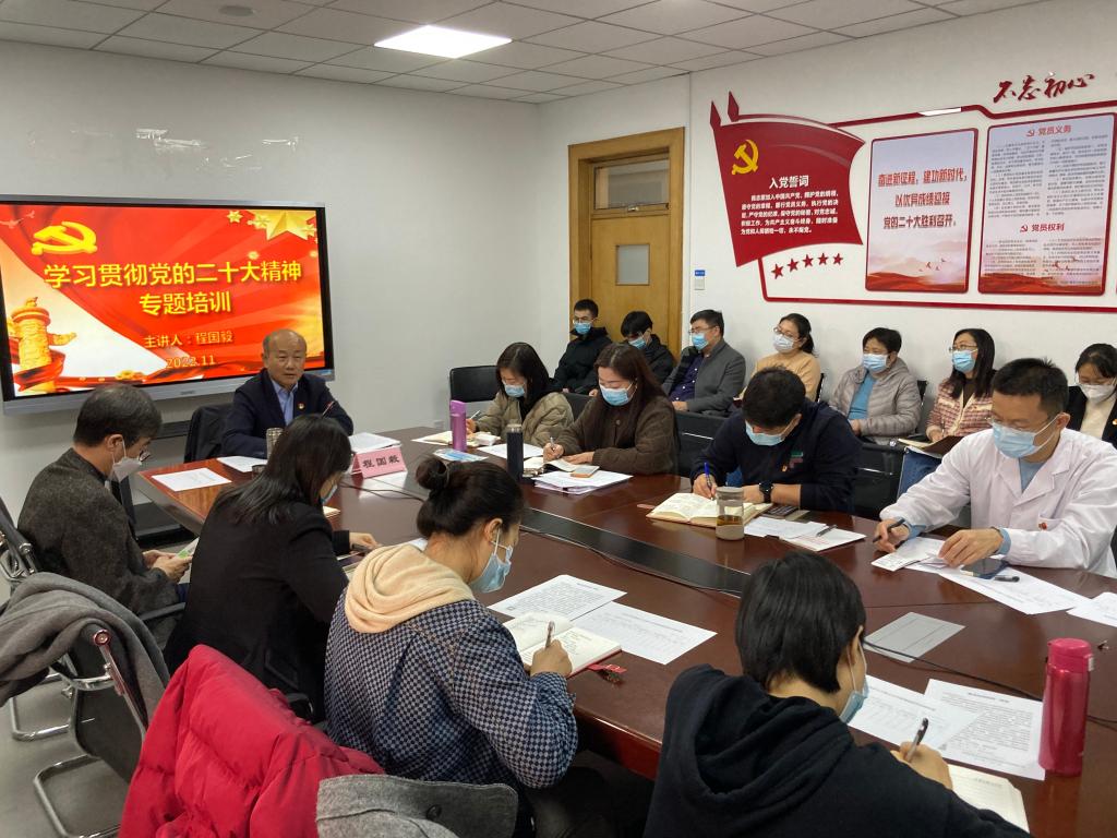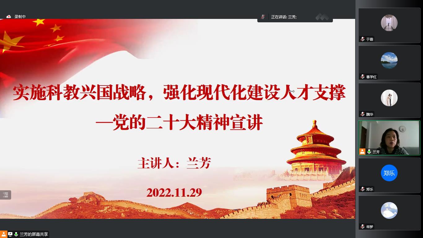 党总支书记田芃通过线上线下相结合的方式,以“踔厉奋发勇毅前行——深入学习贯彻党的二十大精神”为主题,分别面向全体教工和员工进行两次宣讲。田芃围绕党的二十大的主题和主要成果、过去5年的工作和新时代10年的伟大变革、中国式现代化的五个特色及本质要求、全面建设社会主义现代化国家的目标任务、坚持党的全面领导和全面从严治党、应对风险挑战和教育、科技、人才工作的部署等方面,对党的二十大精神进行了全面宣讲和深入阐释。